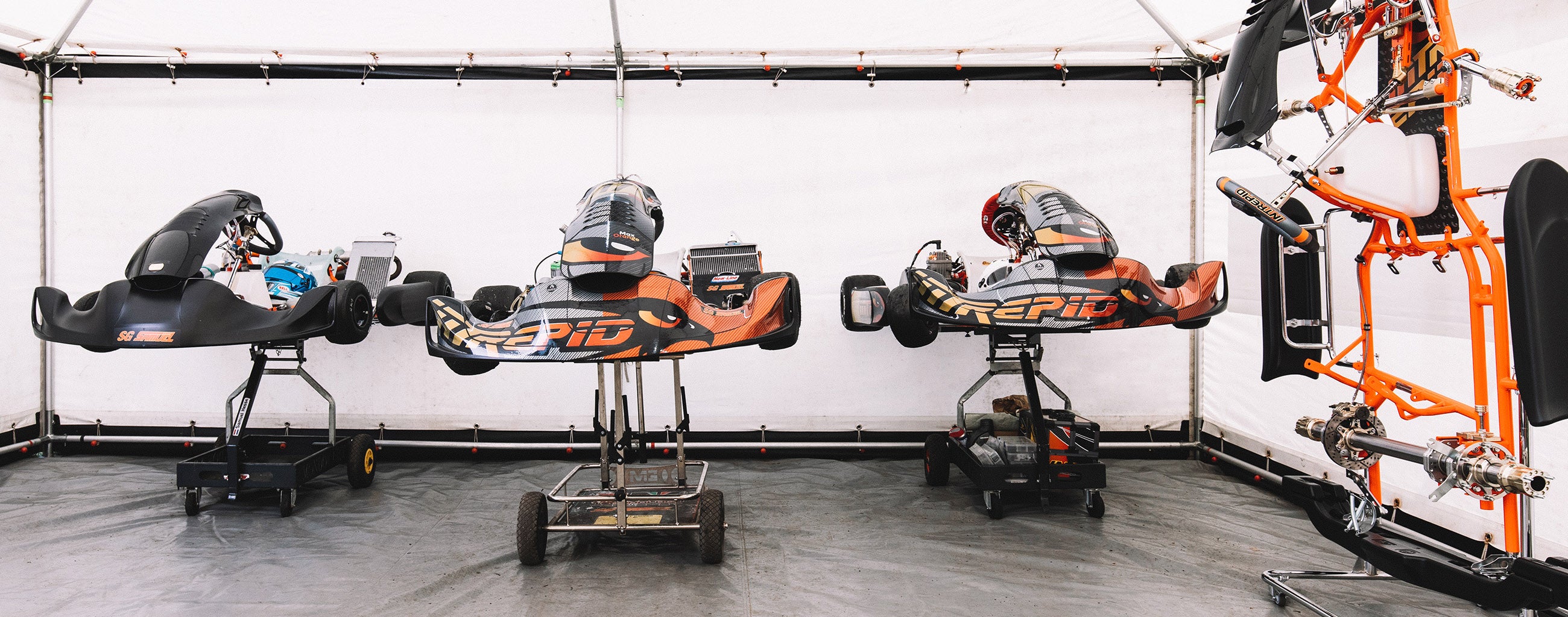 A 90 m² Tent for up to 8 Karts and a fully equipped racetrancporter with spare parts, engines and tools needed for a race weekend.